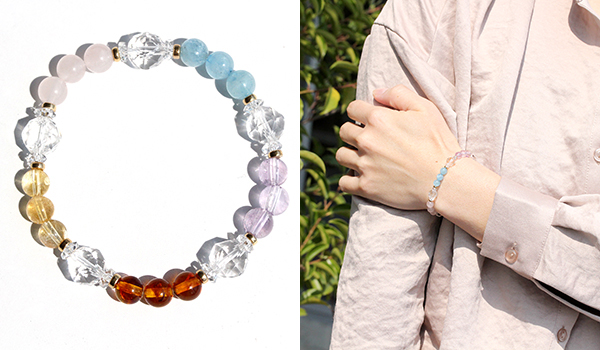 という、5種類の淡い色合いの石でまとめた、可愛らしい見た目のブレスレットです。
