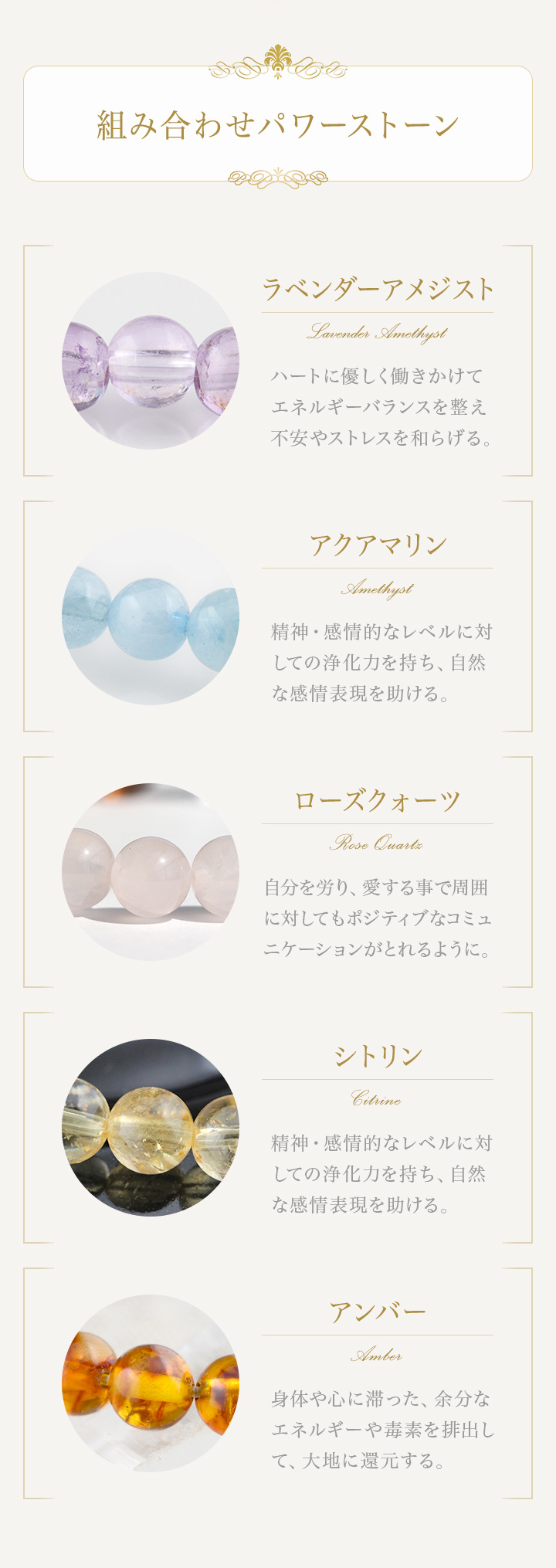 この使用した5種類の石がそれぞれ持ち主に働きかけ、心に安らぎと穏やかさをもたらし、内面の澱み(よどみ)をクリアにしていきます。