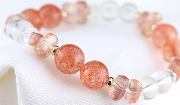 オレゴンサンストーンの地色は、大きく分けてレッド系、イエロー系、グリーン系の3つのカラーに分類されますが、今回使用しているブレスレットには、オレゴンサンストーンの王道カラーとも言えるオレンジピンク色のもの。