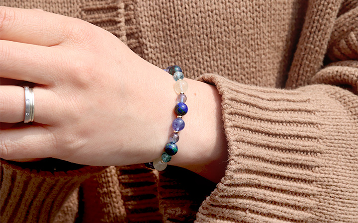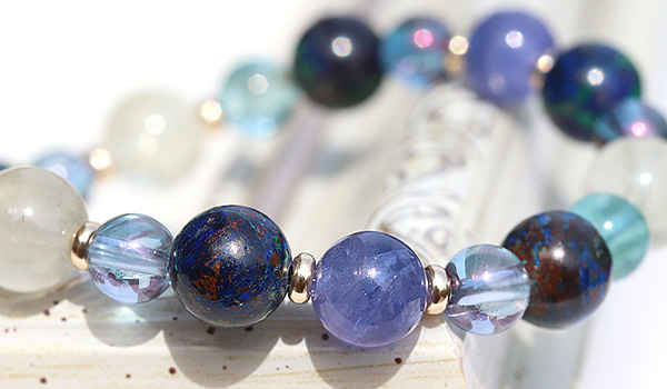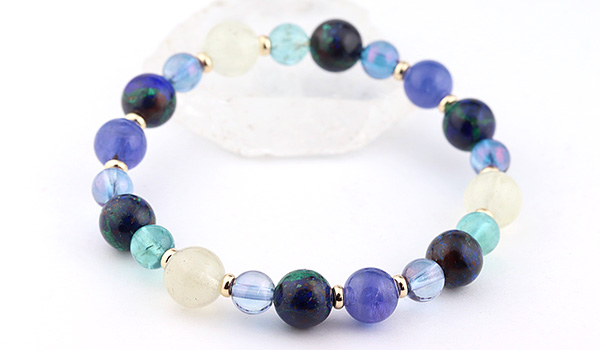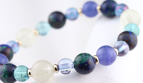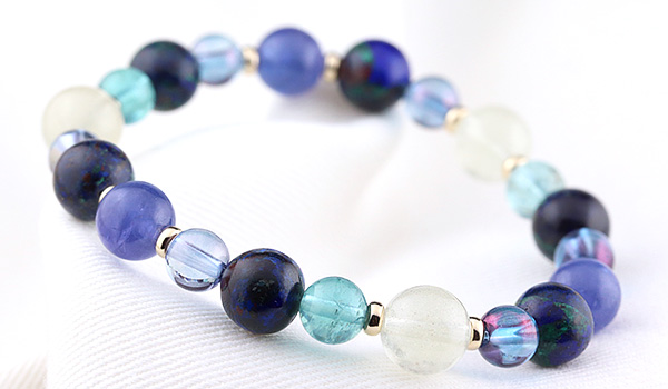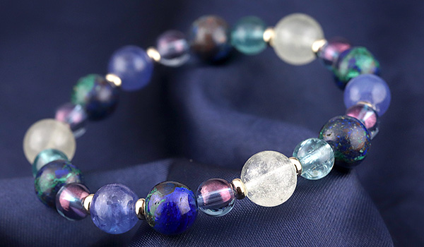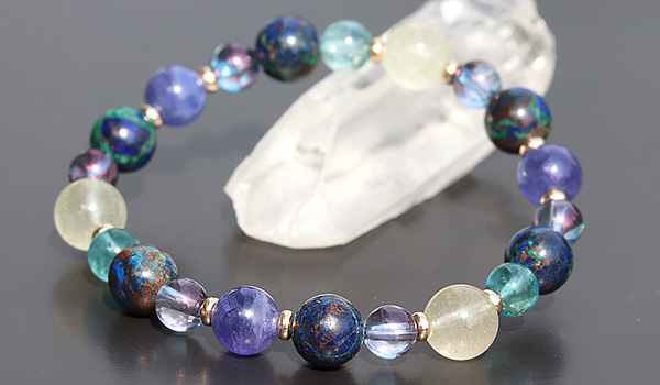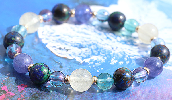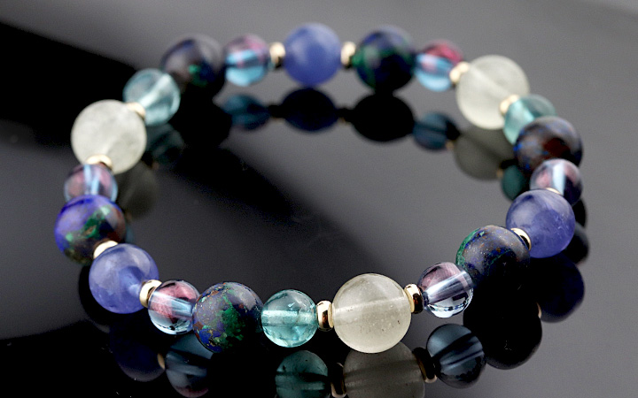 完全限定品ブレス【チャネリングアイ】は、組み合わせの意味合いはもちろんのこと、タンザナイト・アジュライト・コスモオーラのブルーを基調とした中に、リビアングラスのゴールドと、ブルーグリーンアパタイトのエメラルドブルーがさりげないアクセントとなった、