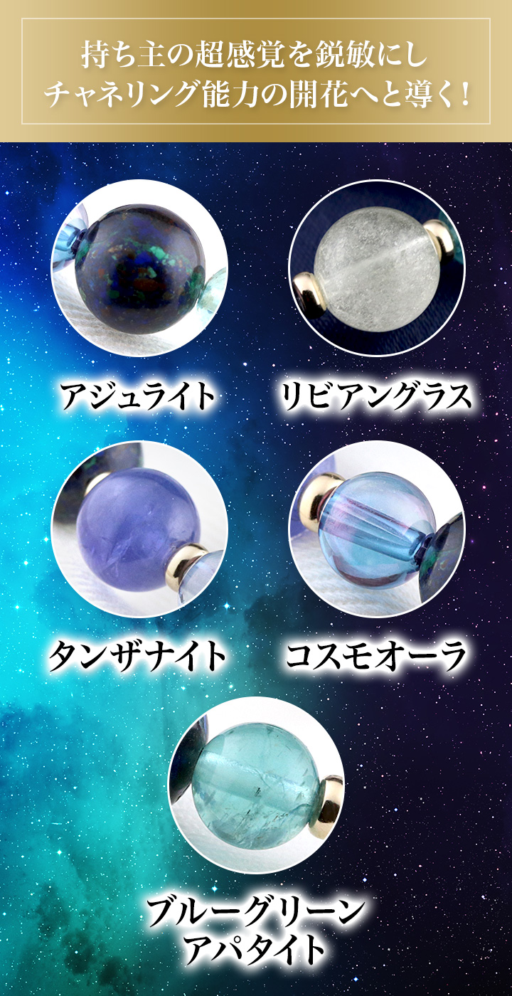 超感覚を鋭敏にし、チャネリング能力の開花やレベルアップへと導く、5種類の石たちを組み合わせたブレスレットです。