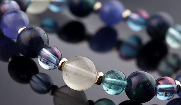 さらに南国の海を思わせる、鮮やかで美しいエメラルドブルーの発色が魅力的なブルーグリーンアパタイトは、とろんとした光沢のあるものを選んで組み合わせました。