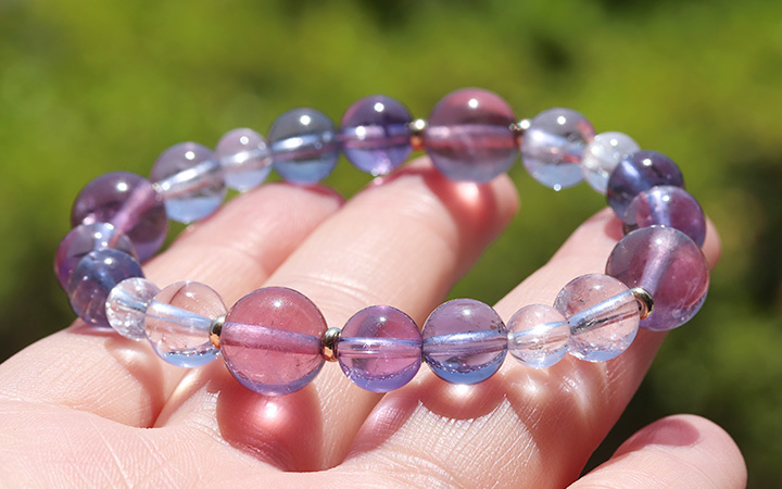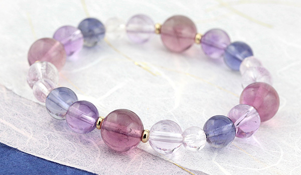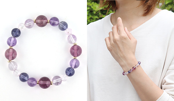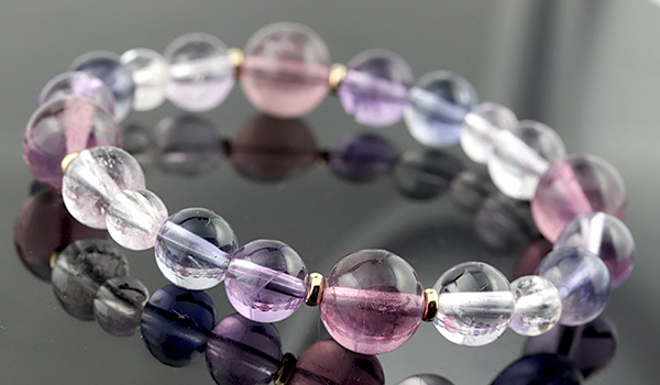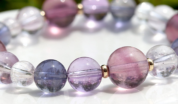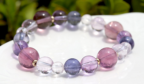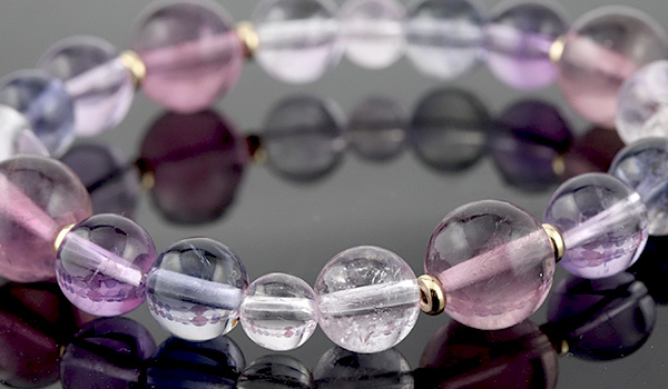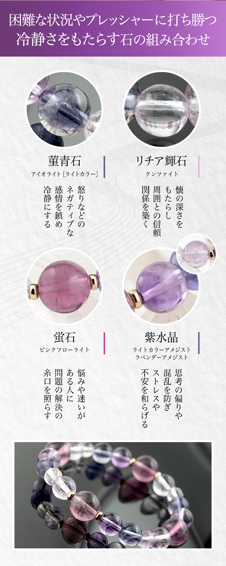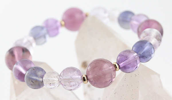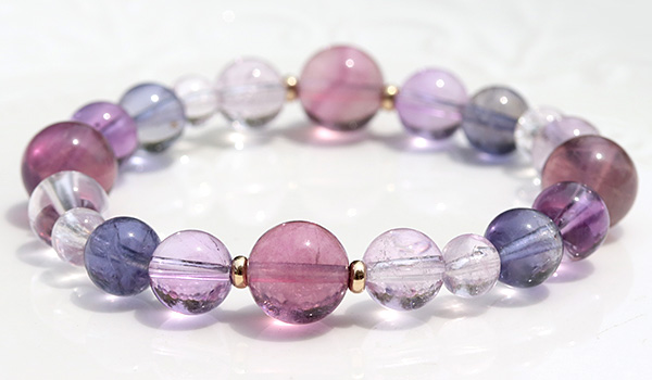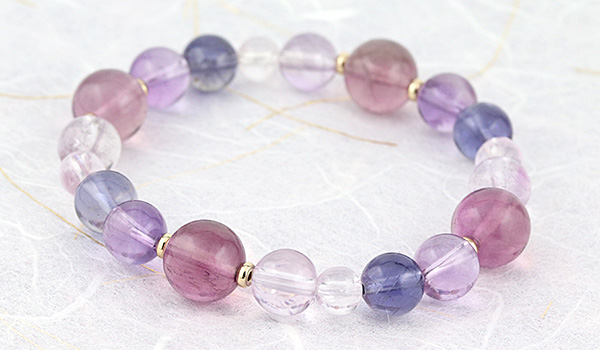 ピンクフローライト10mm、ライトカラーアメジストAAA'8mm、ライトカラーアイオライトAAA'8mm、クンツァイトAAAA6mm、ラベンダーアメジストAA8mm