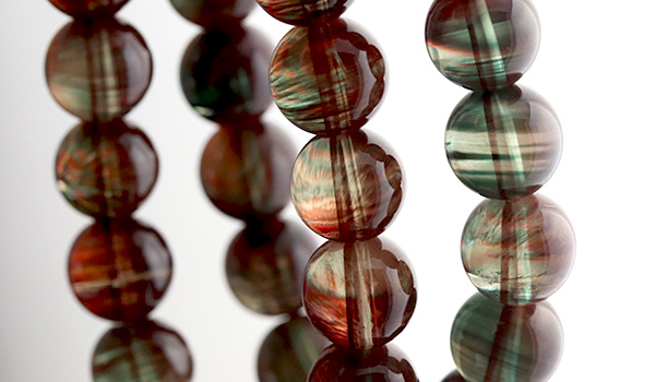 光に透かせば、深みのある赤色はガーネットのようなうっすら透明感のある赤色に見え、ビーズを回転させると赤色よりも緑色が際立って見え、不思議な印象を与えてくれます。