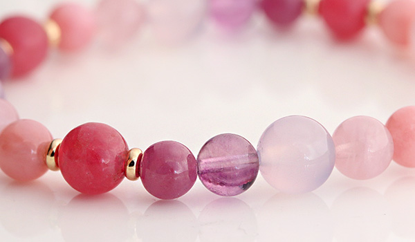 ブラジル産ロードナイト7mm、ルビーAAA6mm、ピンクフローライト6mm、ピンクカルセドニー7.5〜8mm、ディープローズクォーツAA5.5〜6mm、ピンクオパールAAA6〜6.5mm