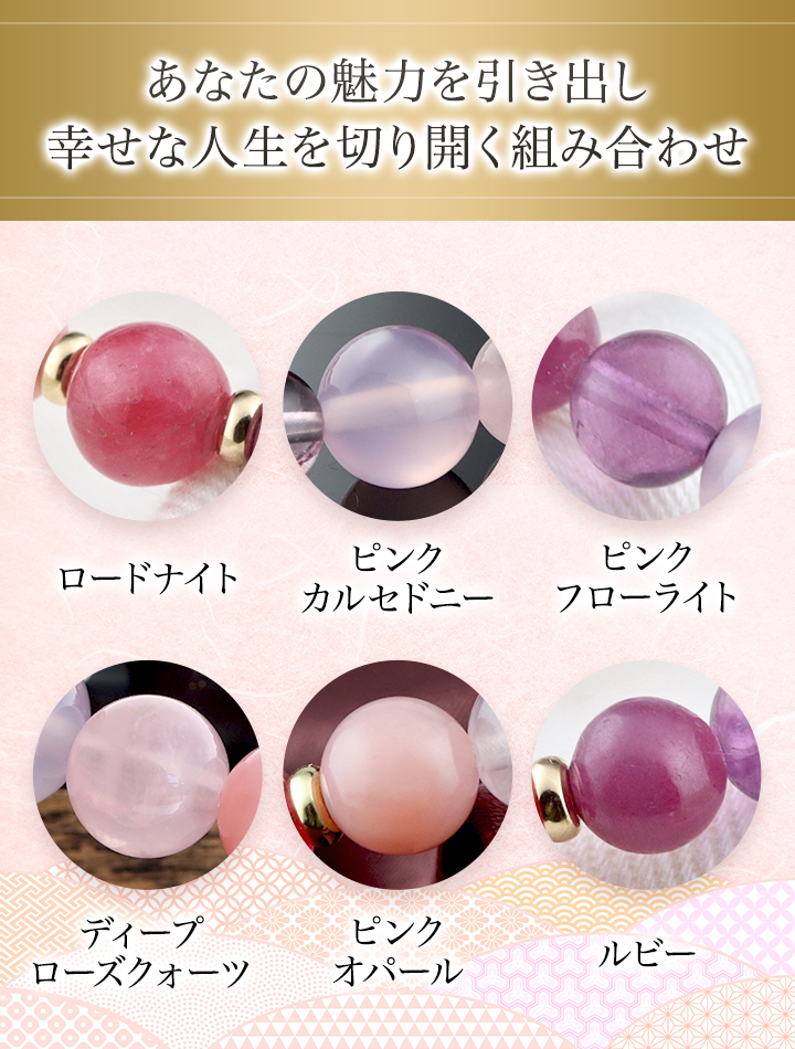 あらゆる人間関係の縁を結び絆を繋ぐピンクカルセドニーを組み込むことで、恋愛関係における出会いを増やし、