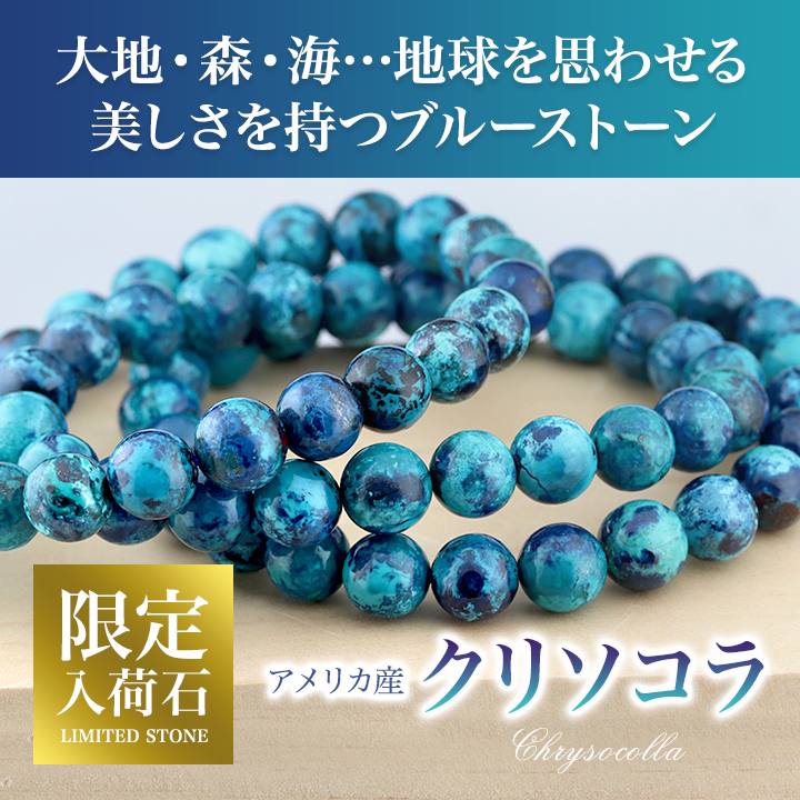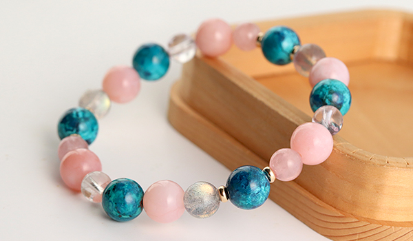 アメリカ産クリソコラ8.5〜9mm、ディープローズクォーツAA6mm、ピンクオパールSA6mm、クンツァイトAAAAA6mm、ラブラドライトSA7mm