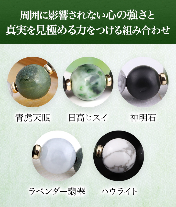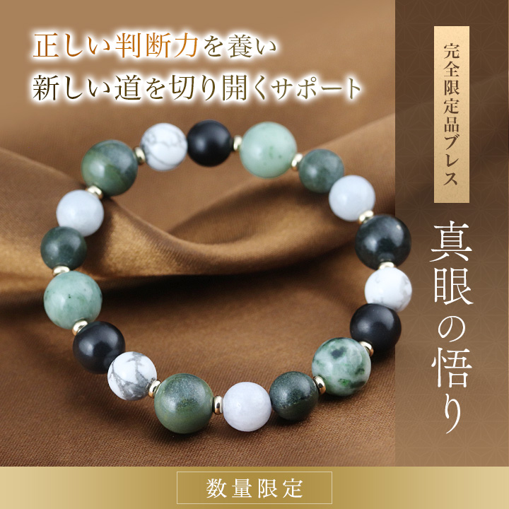 あなたを欺こうとするフェイクを見抜き、正しいものだけを見極められる真眼を養い、広い視野で自分と世界とを見つめながら未来を切り開いていく方をサポートする組み合わせブレスレットです。