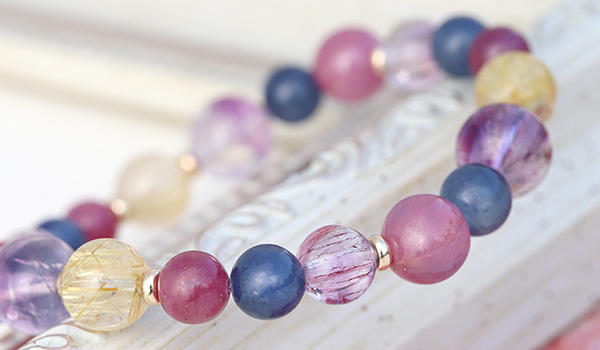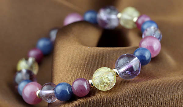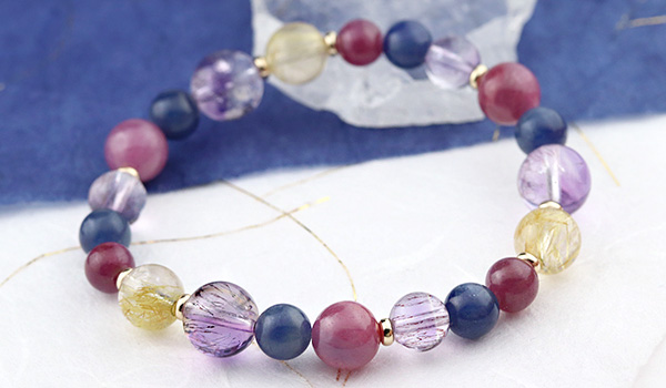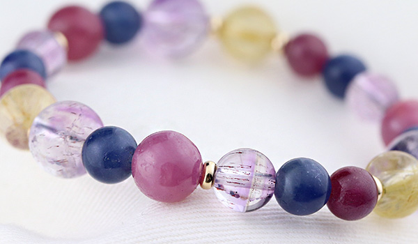 ルチルクォーツSA8mm、ルビーAAA6mm、ルビーAAA'7.5〜8mm、ブルーサファイア6.5〜7mm、カラバルアメジストエレスチャルクォーツAA+7mm・9mm