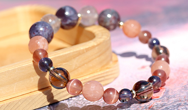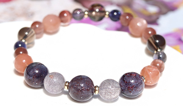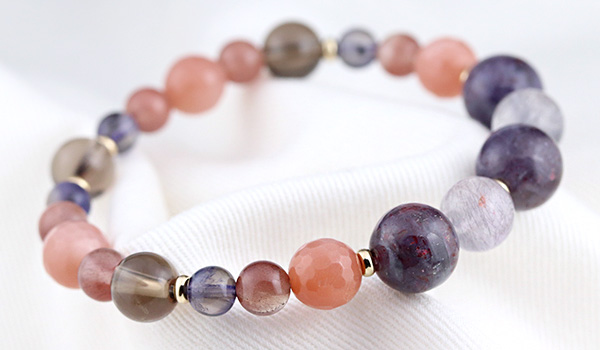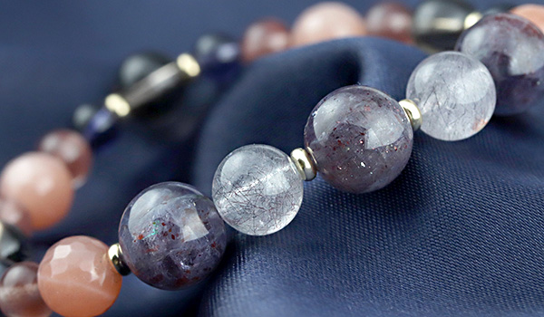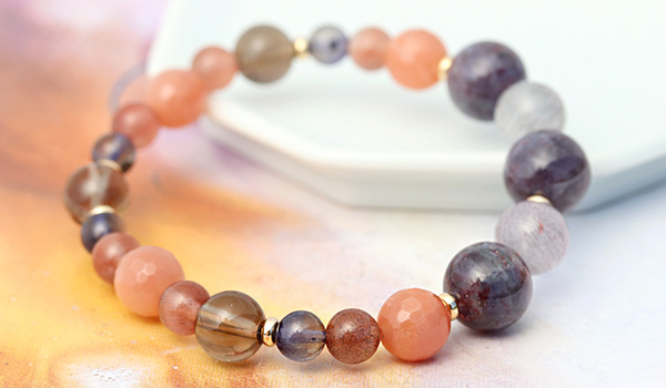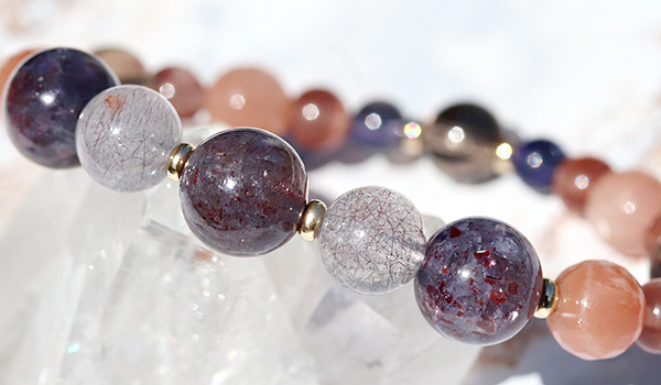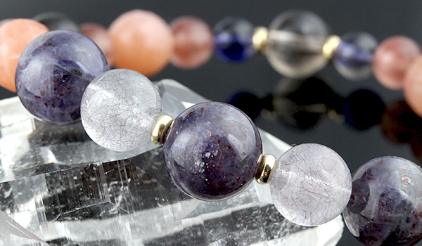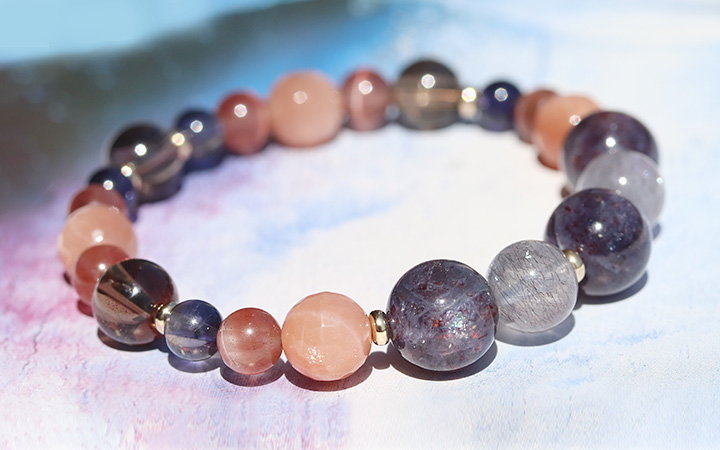 アベンチュリンアイオライト10〜10.5mm、セイクリッドセブン8.5〜9mm、オレンジムーンストーン[128面カット]8mm、スキャポライトキャッツアイAAA6mm、アイオライトAAA6mm、スモーキークォーツ8mm