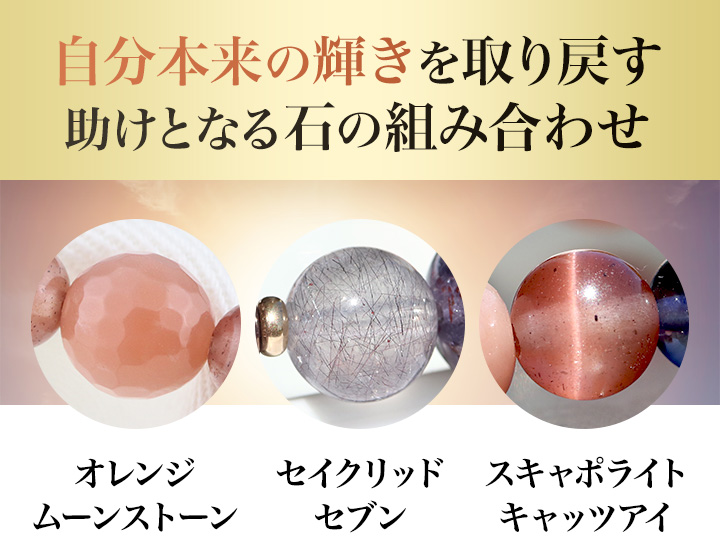 自分本来の輝きを取り戻し、自分らしい幸せを見つける助けとなるオレンジムーンストーン・セイクリッドセブン・スキャポライトキャッツアイを組み合わせました。