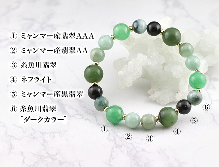 ミャンマー産翡翠AAA9〜9.5mm、糸魚川翡翠[ダークカラー]8mm、ミャンマー産黒翡翠8mm、ネフライト10〜10.5mm、糸魚川翡翠8mm、ミャンマー産翡翠AA8mm
