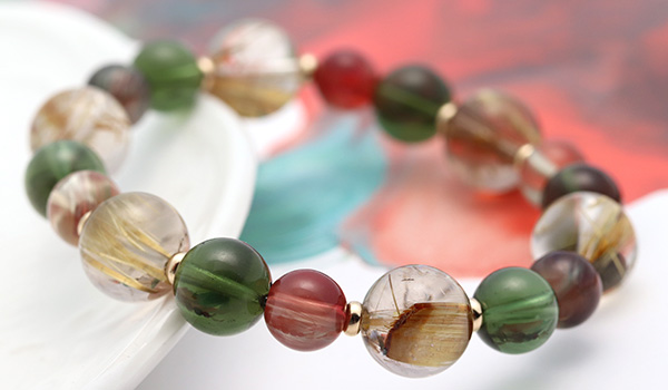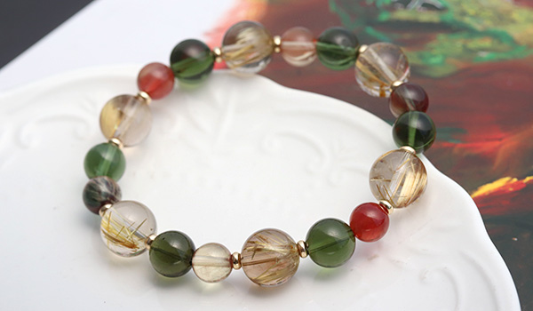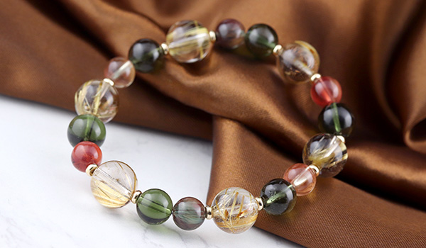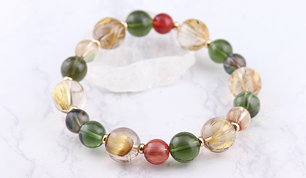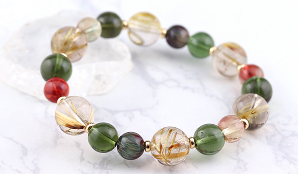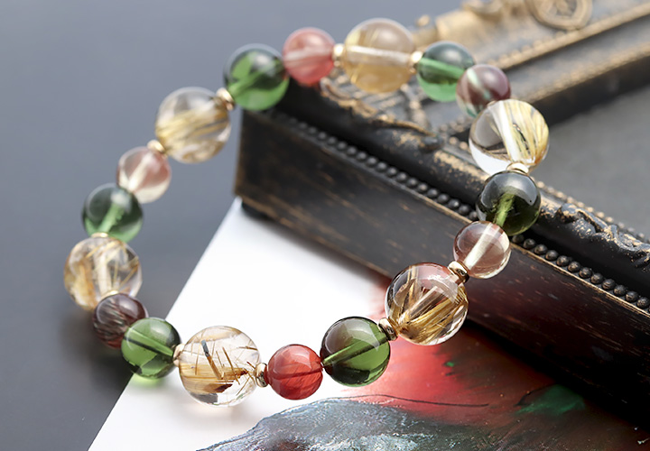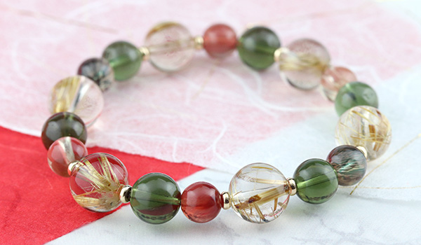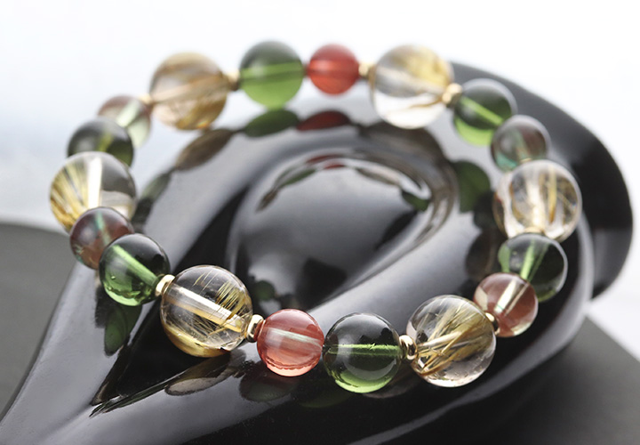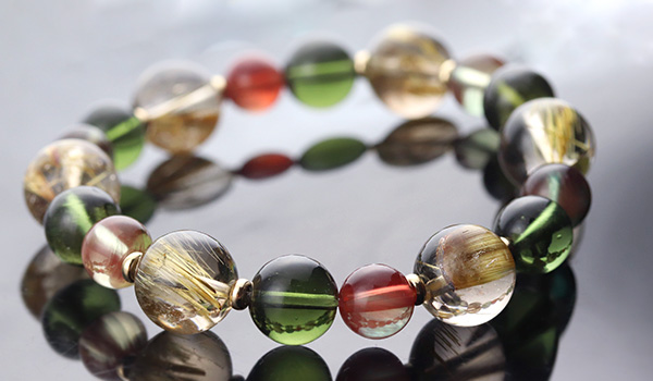 タイチンルチルクォーツPG10.5〜11mm、モルダバイト8〜9mm、アンデシン7.5mm