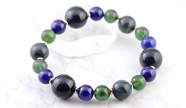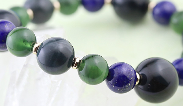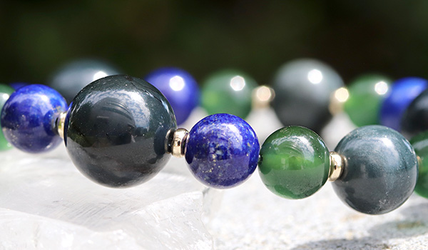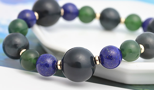 神居古潭石[ブラックカラー]12mm、ラピスラズリAAA8mm、サーペンティン7.5〜8mm、神居古潭石[ブルーカラー]10mm