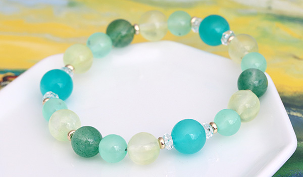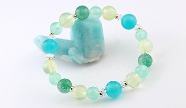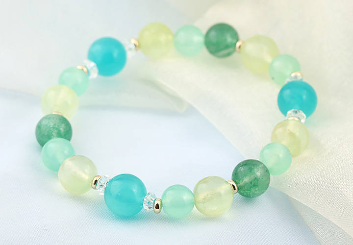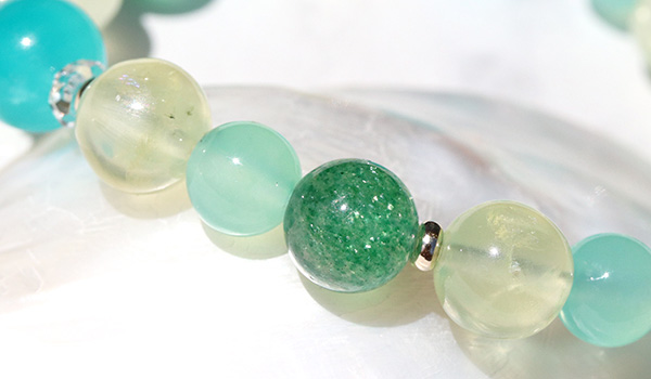 アマゾナイトシリカ9mm、ゴールデンプレナイト8〜8.5mm、クリソプレーズAAA'7〜7.5mm、グリーンアベンチュリン8〜8.5mm