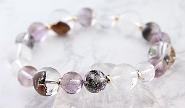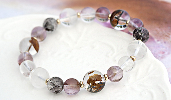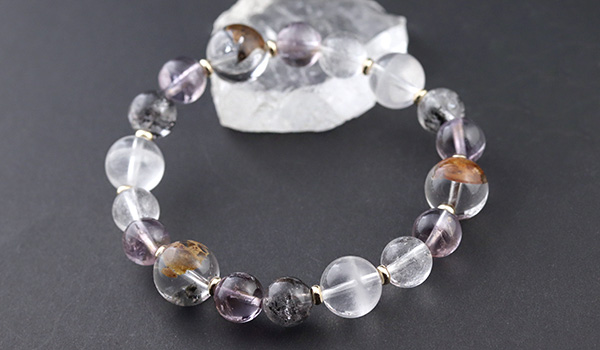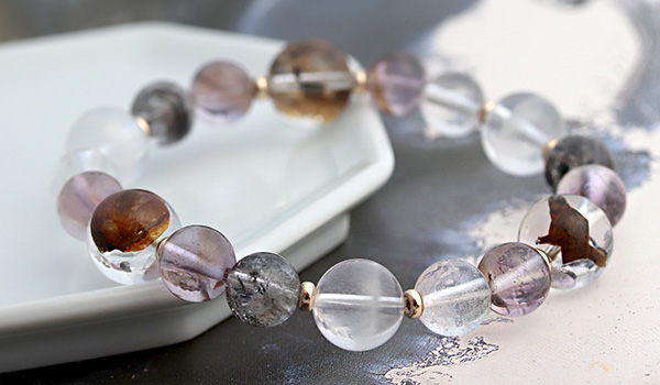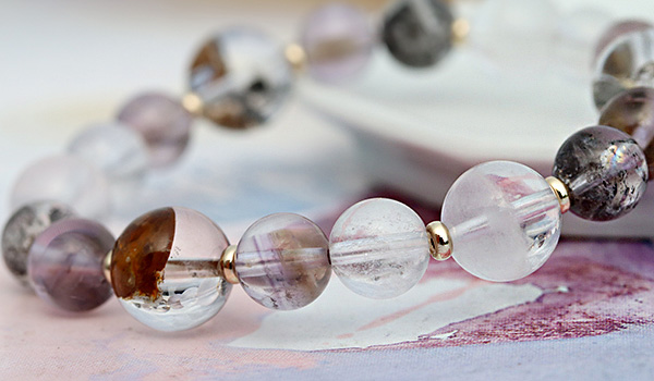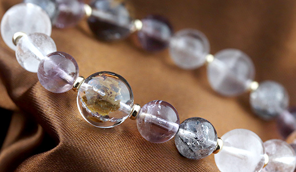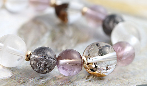 パキスタン・ヒマラヤ産エレスチャルクォーツ10〜11mm、ヒマラヤ産アメジストファントムクォーツ8mm、サチャマニクォーツ8mm・レムリアン水晶9.5〜10.5mm、ヒマラヤ産エレスチャルクォーツAA8mm
