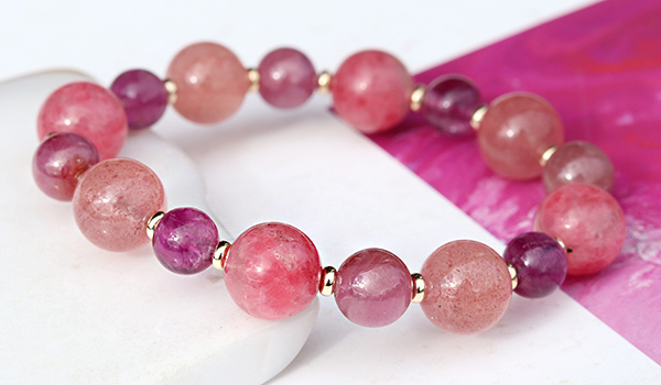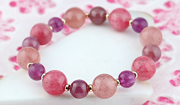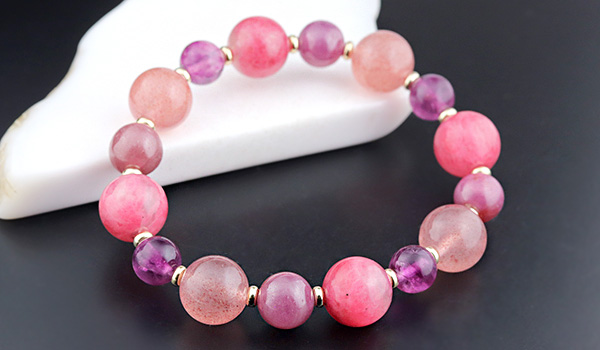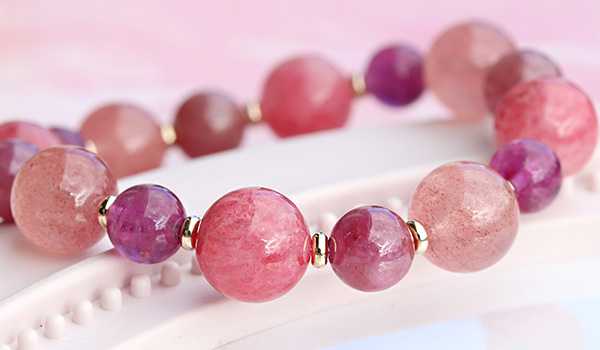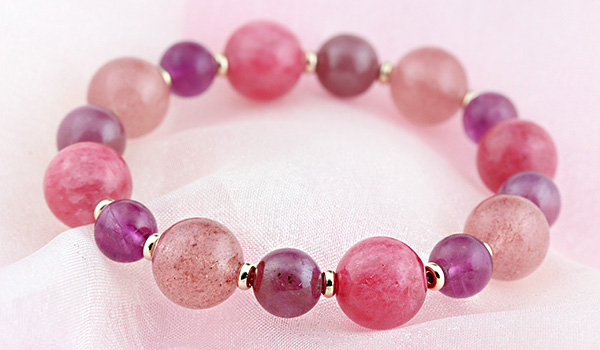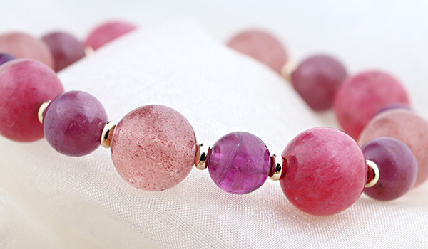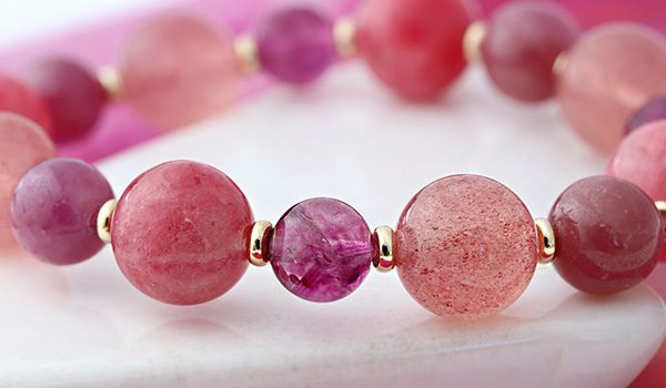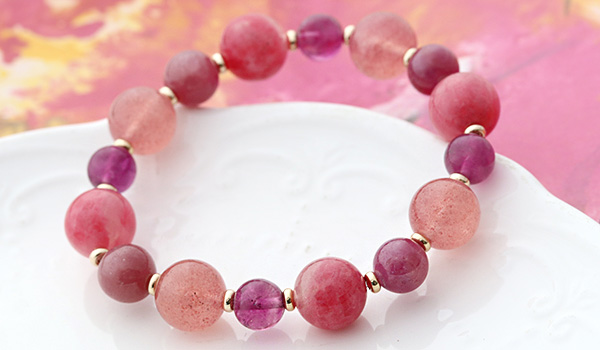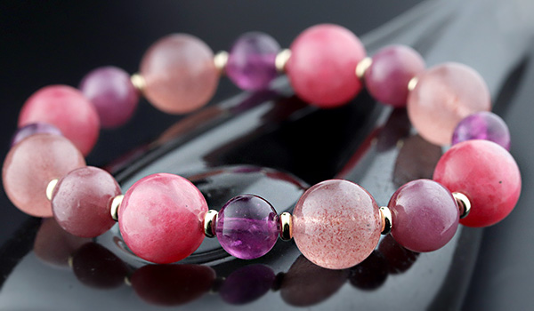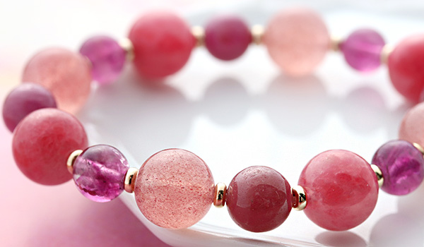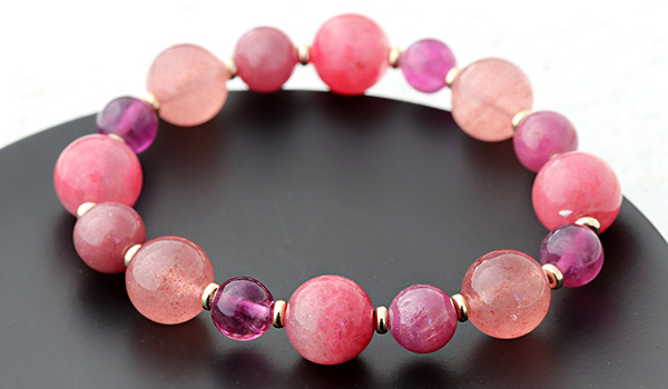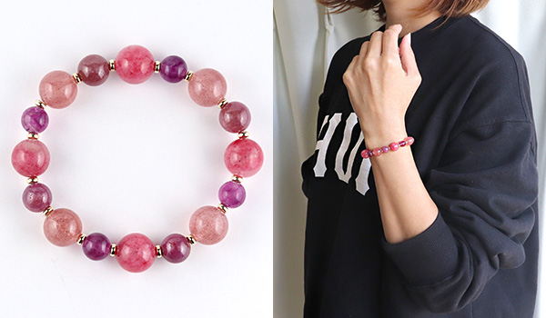 また、こちらのブレスレットはロードナイトの鮮やかなバラ色に、ピンクエピドートインクォーツの優しさを感じさせるオレンジがかった赤色、そしてルビーとピンクフローライトの紫がかった華やいだマゼンタ色と、愛の色をイメージさせるカラーバランスで仕上げています。