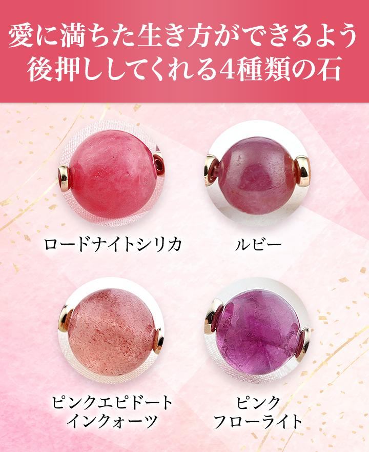 愛に関連するエネルギーを持つパワーストーンばかりを厳選することで、自分が主役の愛に満ちた生き方を叶える組み合わせとなりました。