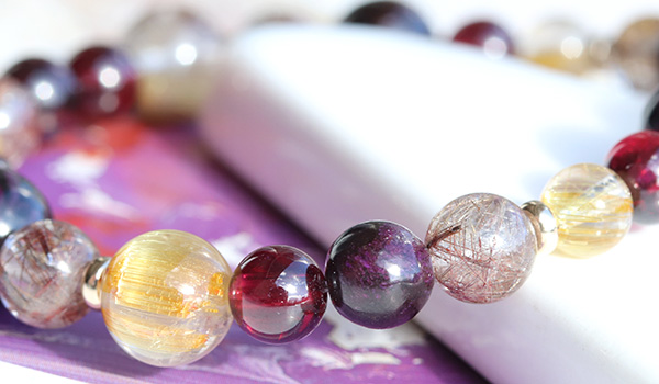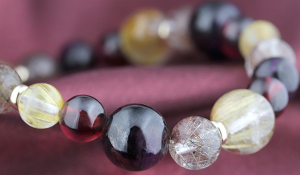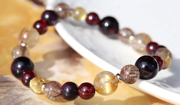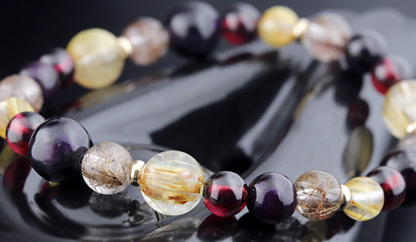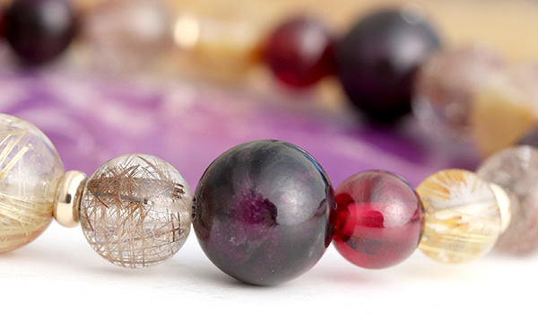 スギライトAAA6〜6.5mm・8mm、シルバールチルクォーツAAA6.5〜7mm、ガーネットAAA’5.5〜6mm、タイチンルチルクォーツAAAA5.5〜6mm・8mm