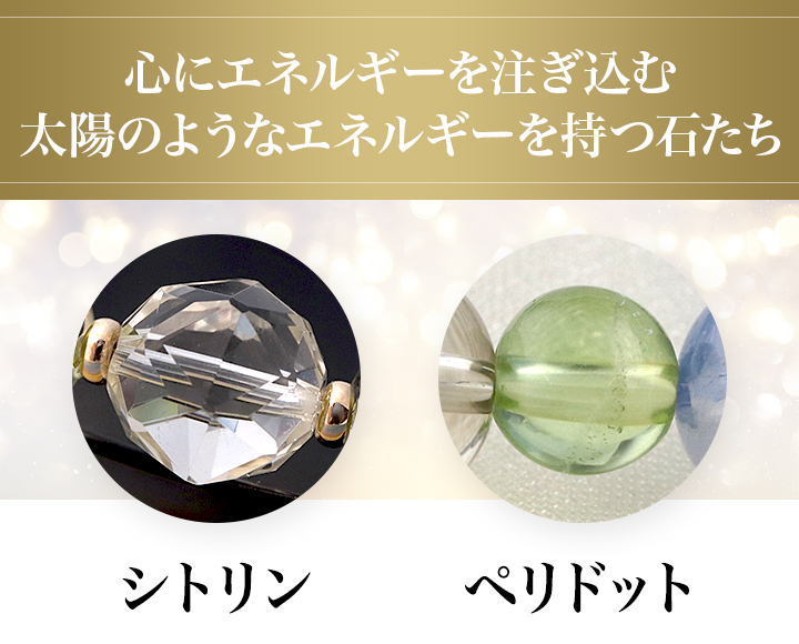 シトリンとペリドットは、どちらも太陽のように明るく希望に満ちたエネルギーを持つ石であり、持ち主の心に栄養となるエネルギーを注ぎ込んでくれます。