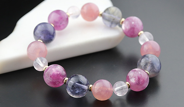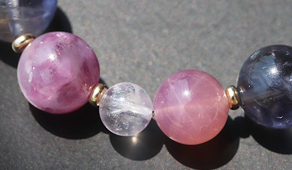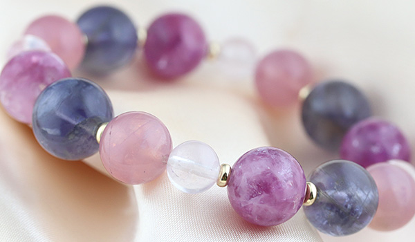 ピンクレピドライト11mm、アイオライト[ライトカラー]11〜12mm、マダガスカル産ディープローズクォーツ9.5〜10mm、ピンクモルガナイトAAA'7mm