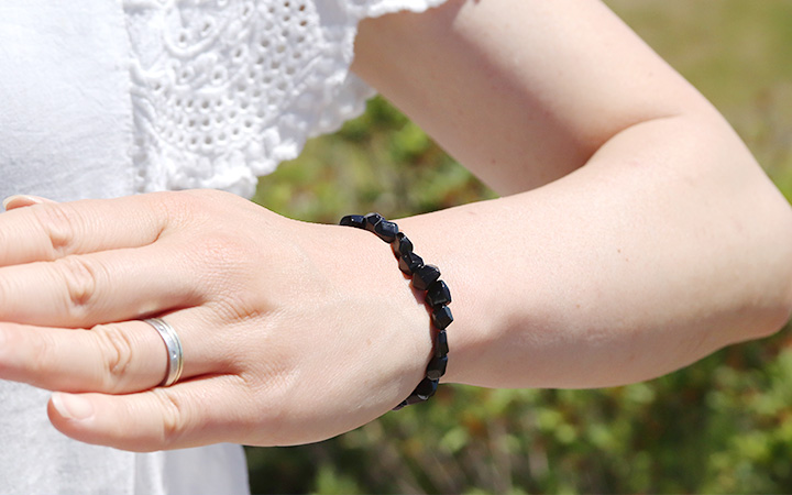 重厚な漆黒に輝くブラックスピネルのさざれパーツを素通しにしたブレスレットです。