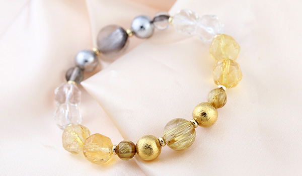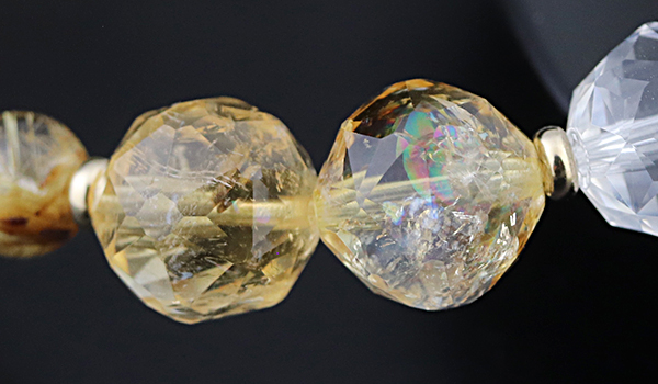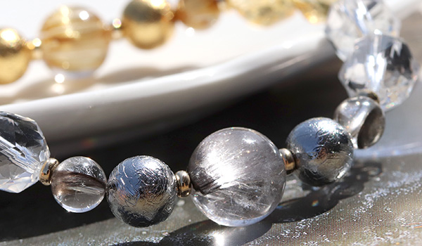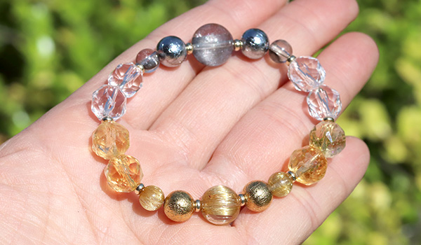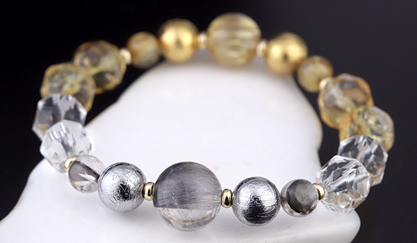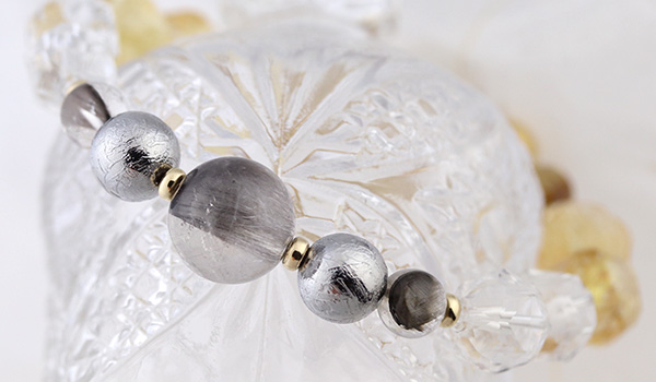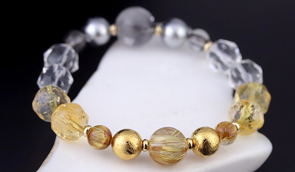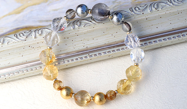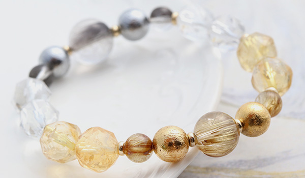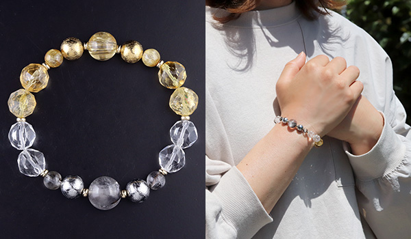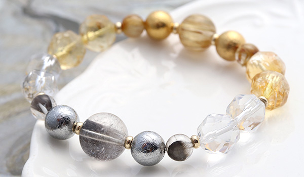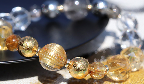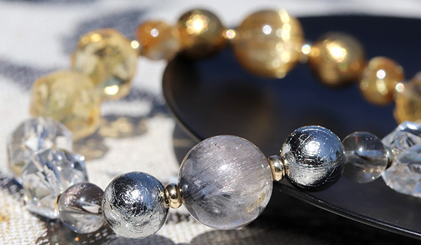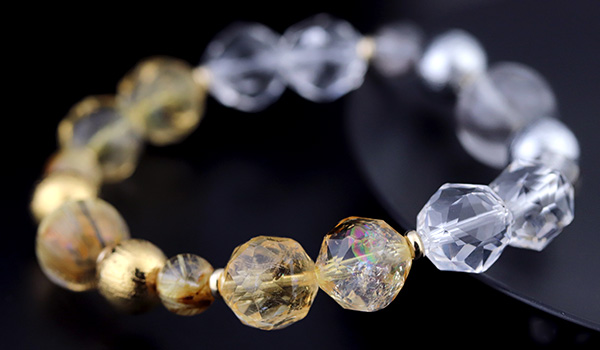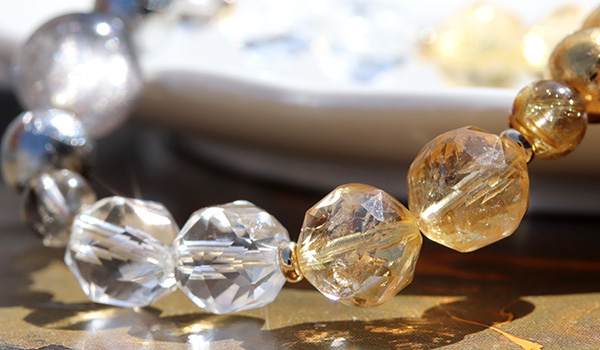 ゴールドカラーのパワーストーンとプラチナシルバーカラーのパワーストーンとを結びつける役割を果たす水晶。