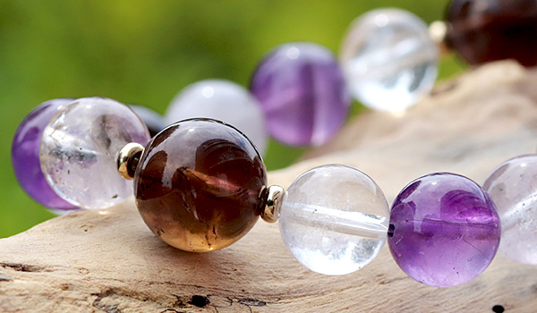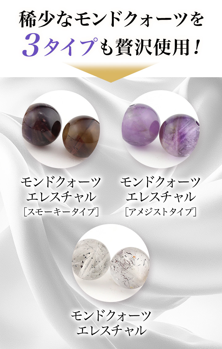 【Crystal Fusion〜クリスタルフュージョン〜】には、そんな稀少すぎるモンドクォーツの原石の中から、エレスチャルを含む部分、スモーキー化した部分、アメジスト化した部分をそれぞれにビーズに磨き上げたものという、3タイプを贅沢に使用しました。