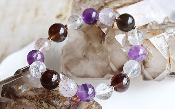 商品名:完全限定品ブレス【クリスタルフュージョンVer.2】(タンザニア産モンドクォーツエレスチャル・タンザニア産モンドクォーツエレスチャル[スモーキータイプ]・タンザニア産モンドクォーツエレスチャル[アメジストタイプ]・レムリアンシードクリスタル)