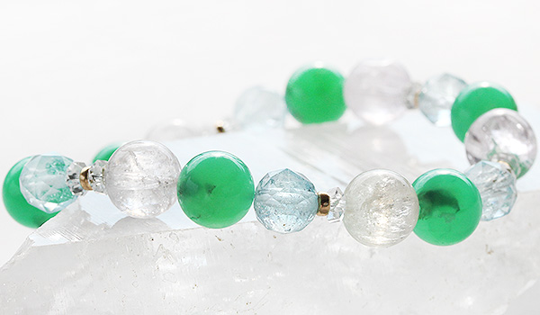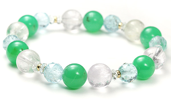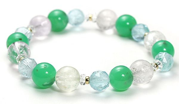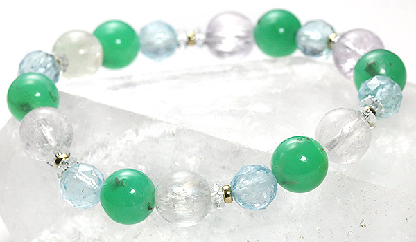 鮮やかなグリーンの発色に、薄っすらと光を通すような柔らかい透明感が美しいクリソプレーズに、ピンクとイエローの淡い色合いがきれいなクンツァイト、さらに涼し気な水色の煌めきが64面カットによって引き立つブルートパーズを組み合わせた、一点もののデザインブレスレットです。