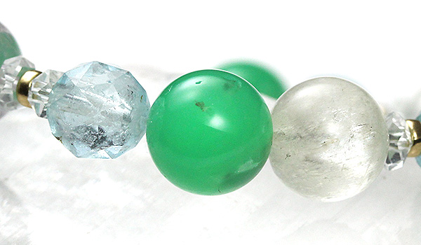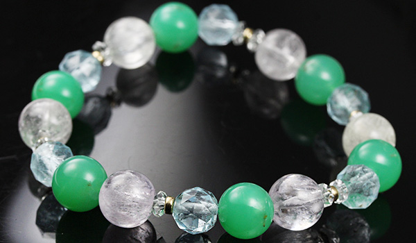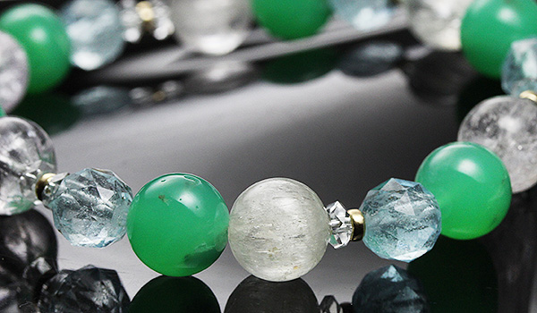 ブレスレットの中で特に目を引くクリソプレーズは、カルセドニーの色変種の中でも、産出量が比較的少なく、美しい物になるととても希少性が高くなる石です。
