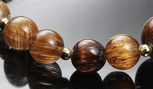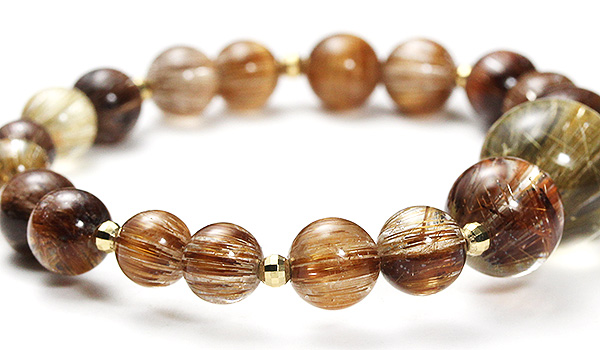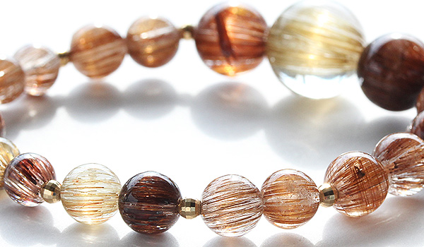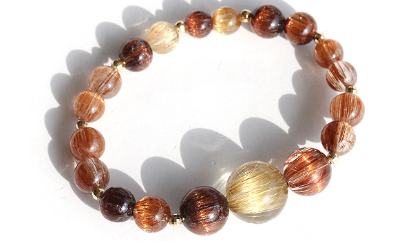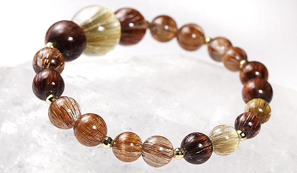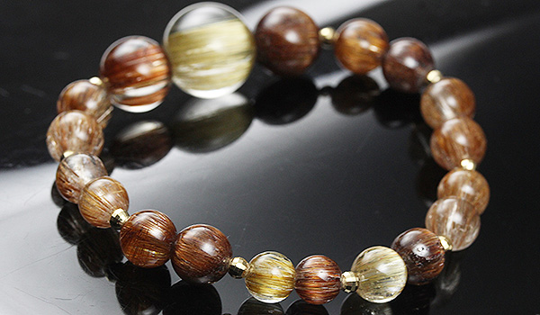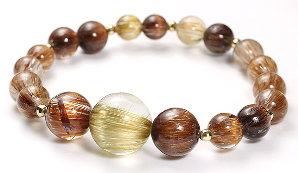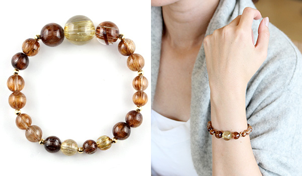 ブレスレットの中央に、美しい黄金の輝きを見せる金針を閉じ込めたゴールデンルチルクォーツを。