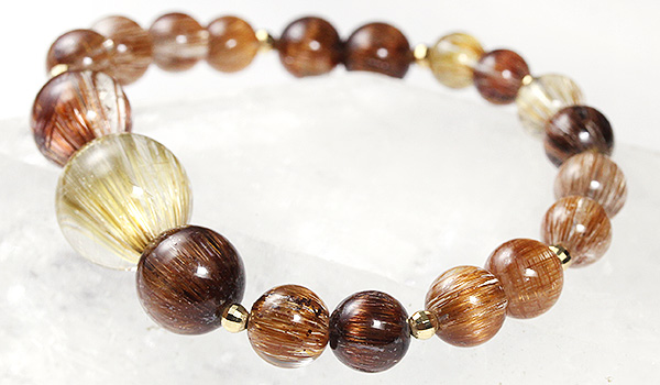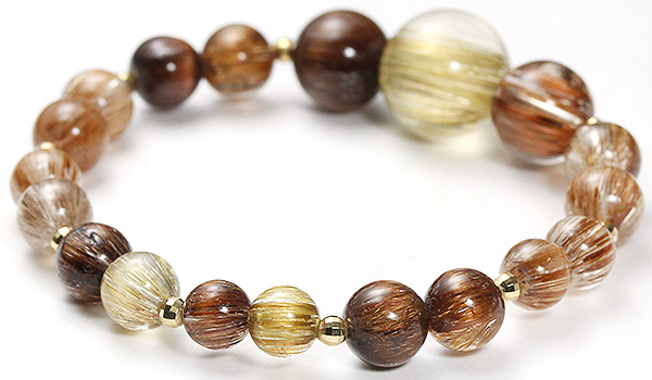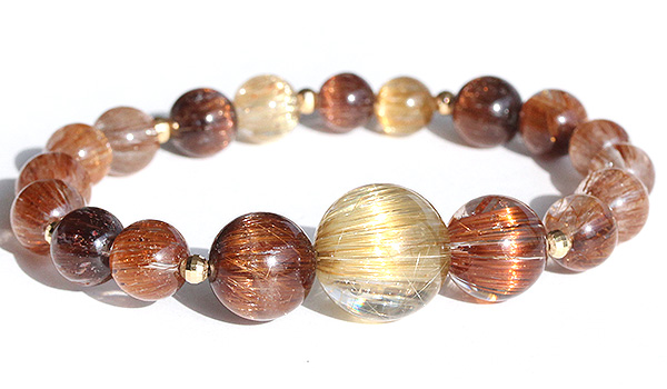 その両サイドにはピンクブラウン、オレンジ、ブラウン、ゴールドと、一珠ごとに少しずつ色合いの異なるルチルを閉じ込めたルチルクォーツをバランスよく並べた、一点もののミックスルチルクォーツブレスレットです。
