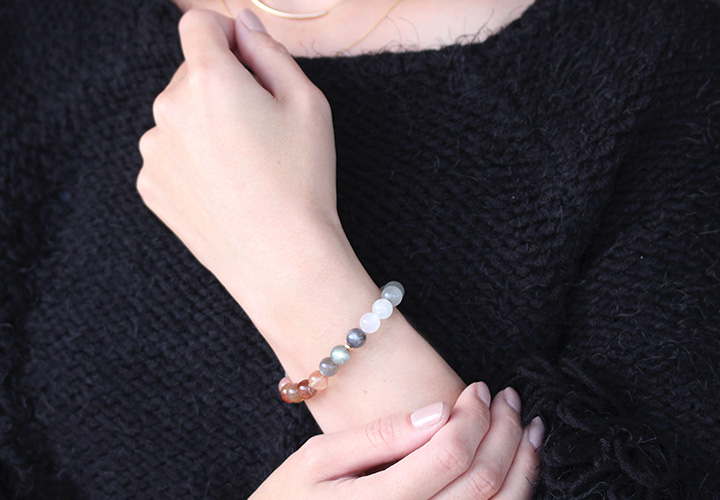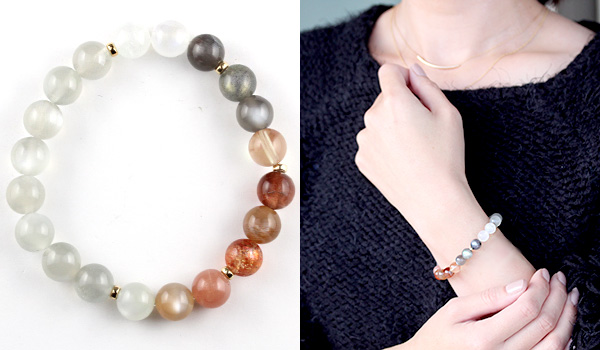 13種類もの長石グループに属する石を使用しているのが特徴で、石好きな方でなくとも思わず目を留めてしまうブレスレット。
