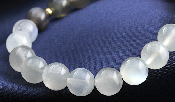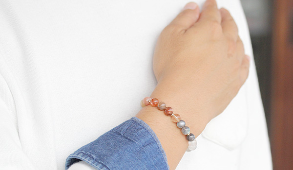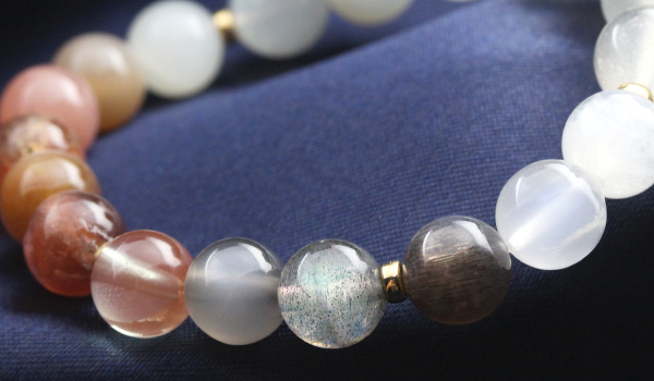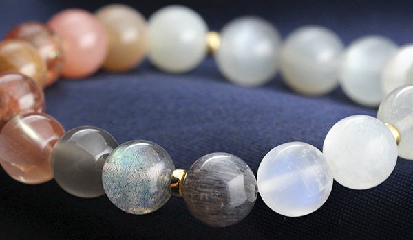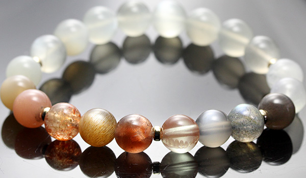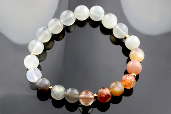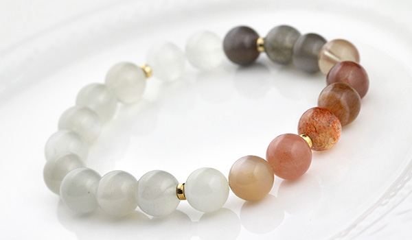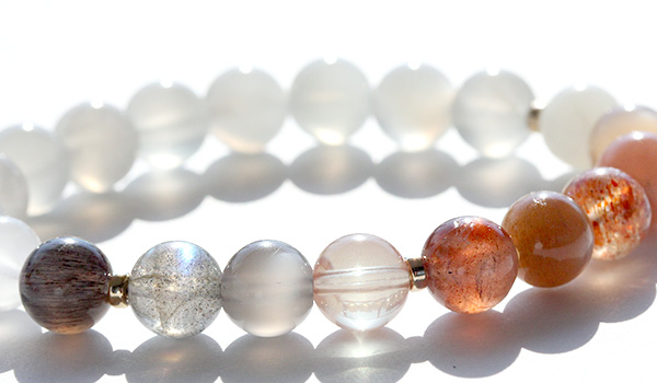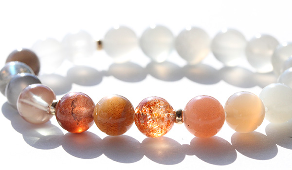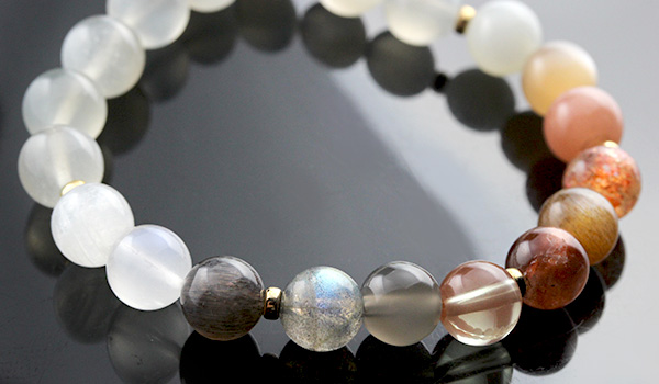 デザインブレス【Grateful Moon〜感謝の月〜】は、人間のバイオリズムに影響を及ぼす月の満ち欠けをイメージできるような5色のムーンストーンと、月の満ち欠けを生じさせるのは太陽の力を持つサンストーンとを組み合わせたブレスレットになっています。