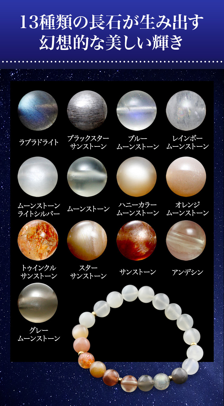 と、実に13種類もの長石を使用した【Grateful Moon ブレス 〜感謝の月〜】は、長石ファン・光学効果ファンにとって最高とも言えるブレスレットなのです。