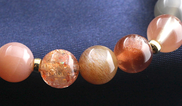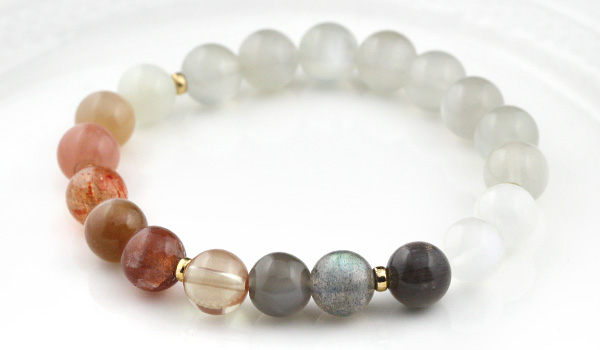このブレスレットには長石として最も有名なムーンストーンをベースに、サンストーン、ラブラドライト、アンデシンと、実に