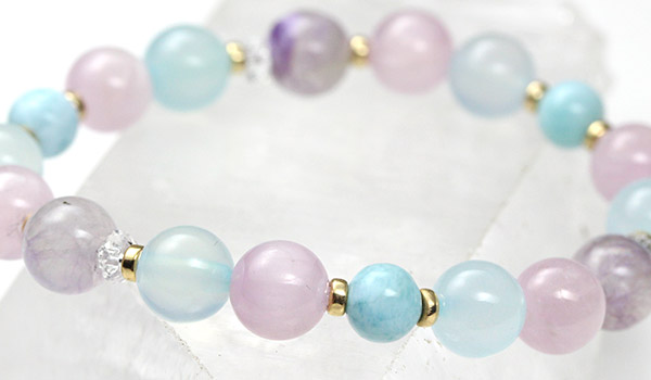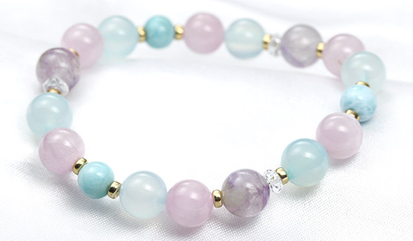 ピンククンツァイトキャッツアイ8mm・シーブルーカルセドニー8mm・エンジェルシリカ8.5mm・ラリマーAAA6.5mm