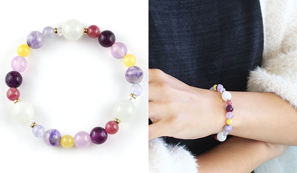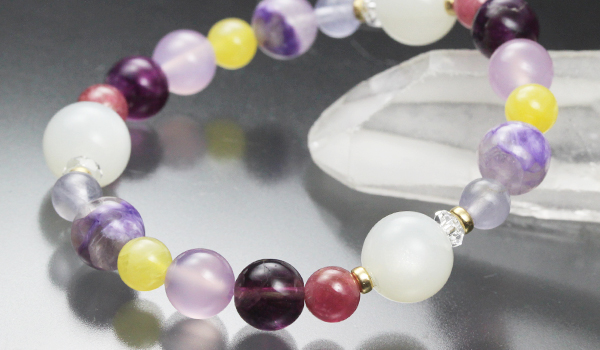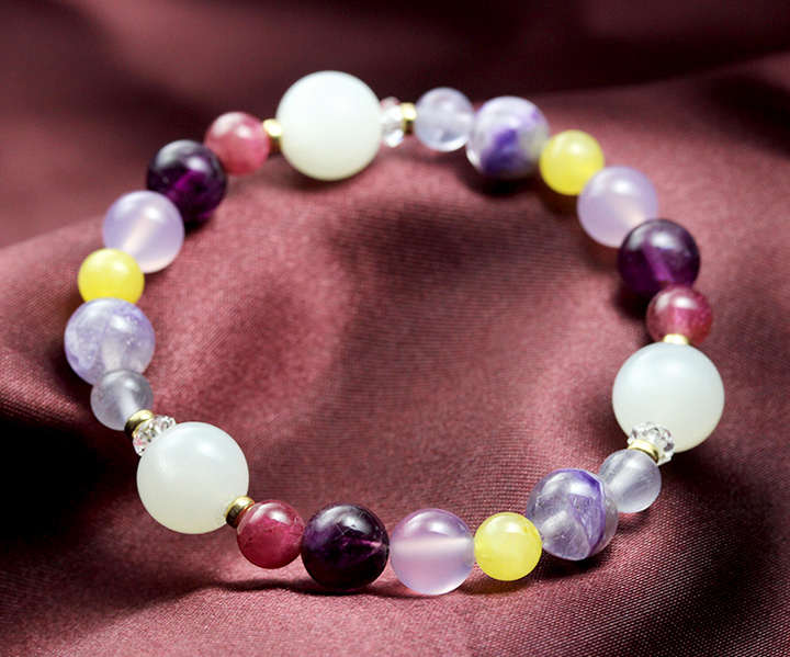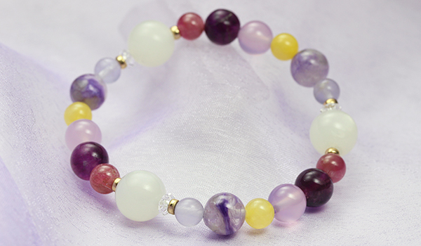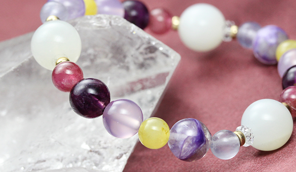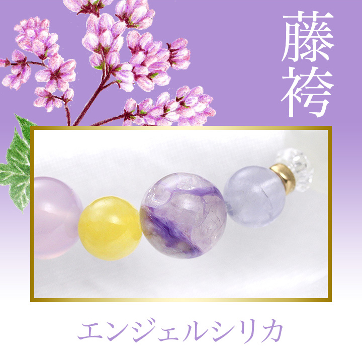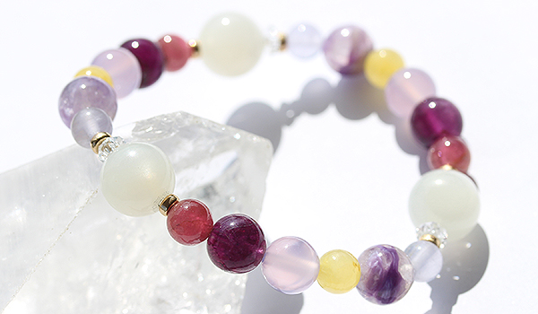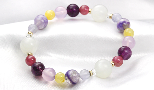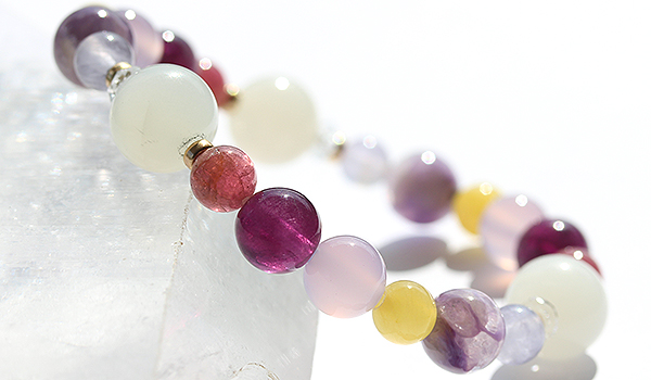 七種類それぞれの花色をイメージさせる石を厳選することで、赤〜紫の色味が主体の華やかさのあるブレスレットとなっています。