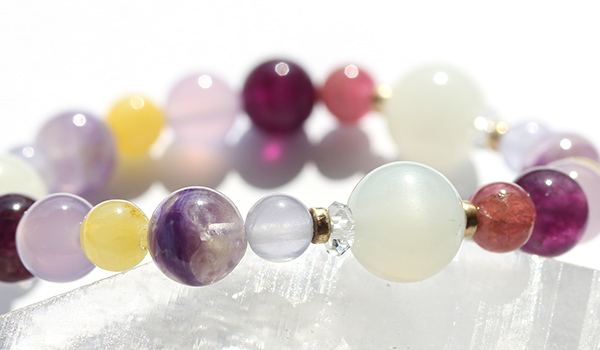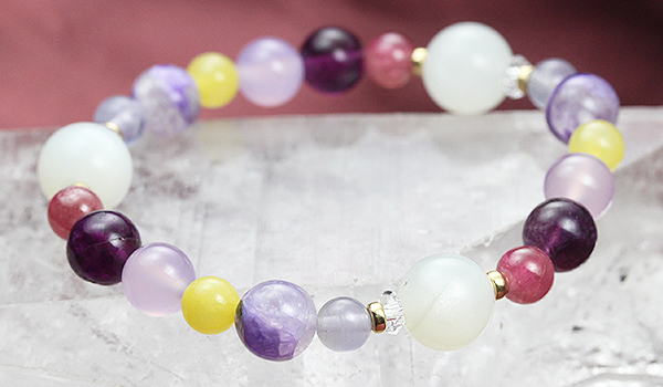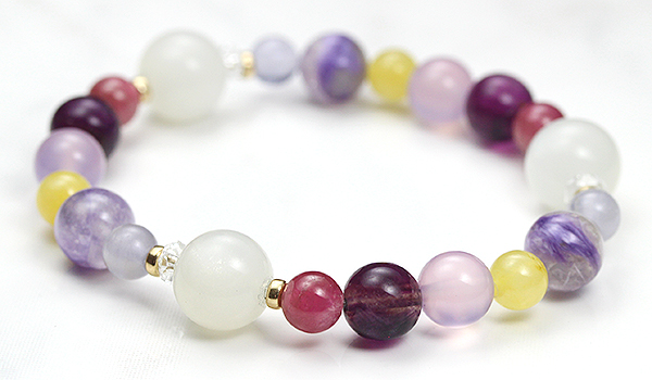 ムーンストーンAAA10mm・ピンクトルマリン6mm・ピンクフローライト8mm・パープルカルセドニー8mm・アラゴナイト6mm・エンジェルシリカ8mm・パープルフローライト6mm