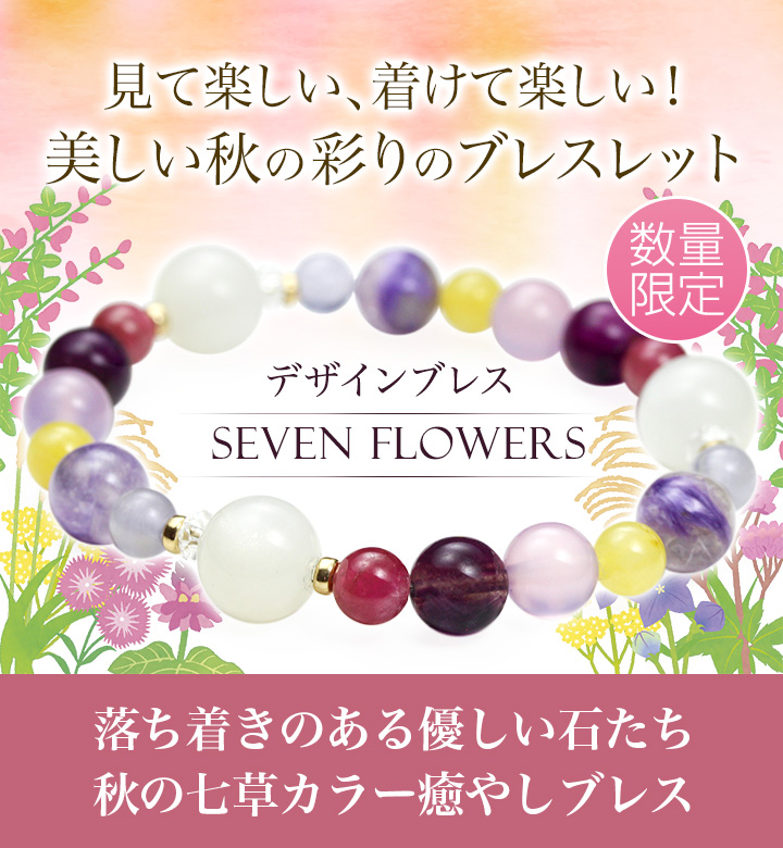 【Seven Flowers〜秋の七草〜】には、秋の訪れを感じさせる七種類の野花の色合いをイメージさせる石をそれぞれ選び、組み合わせました。