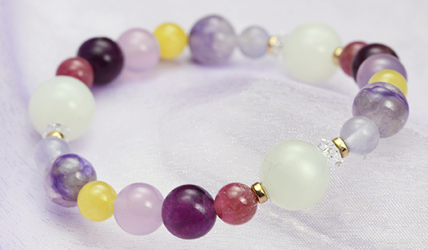 [●]デザインブレス【Seven Flowers〜秋の七草〜】(ムーンストーンAAA・ピンクトルマリン・ピンクフローライト・パープルカルセドニー・アラゴナイト・エンジェルシリカ・パープルフローライト) について