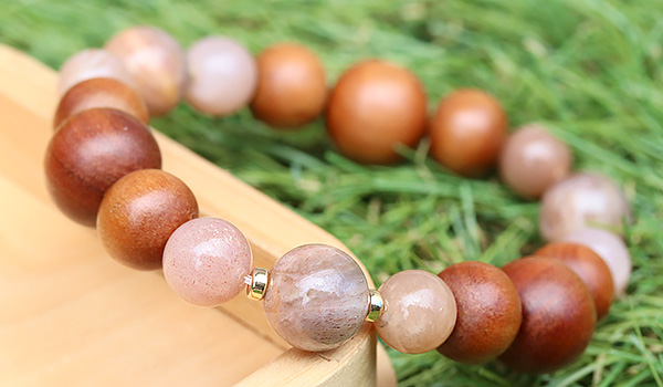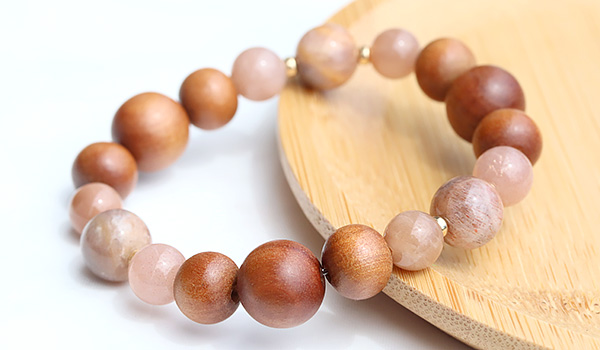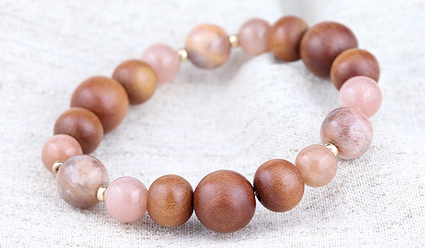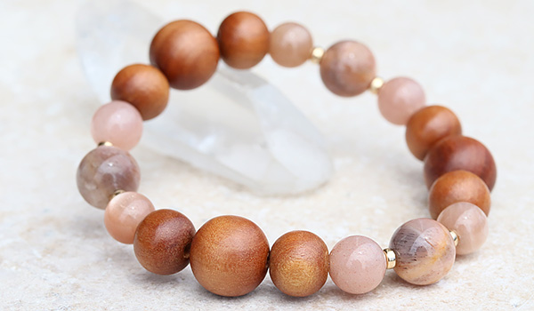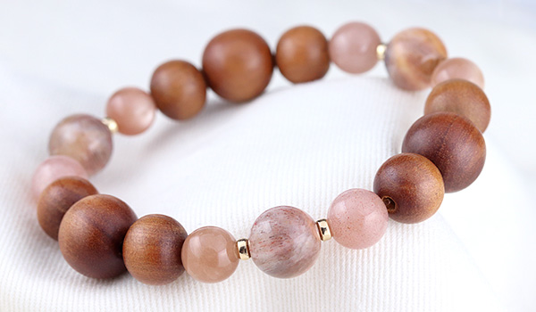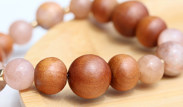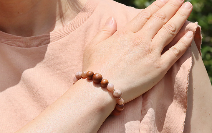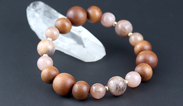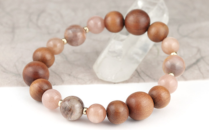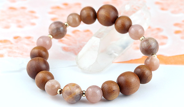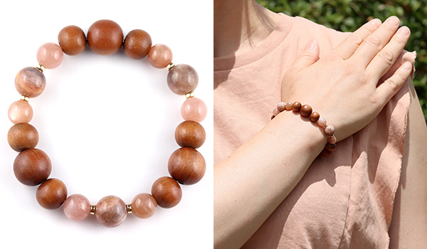 手触りの心地よさや見た目の温もり感が印象的な白檀のウッドビーズをベースに、ピーチオレンジカラー3種類の長石を繋ぎました。