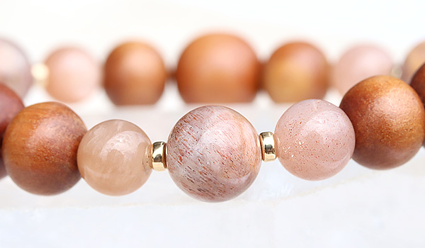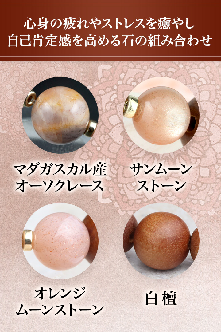 マダガスカル産オーソクレース10mm、サンムーンストーン8mm、白檀10mm・12mm、オレンジムーンストーン8.5mm