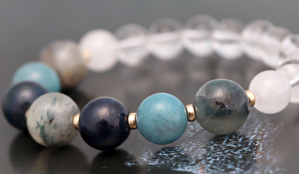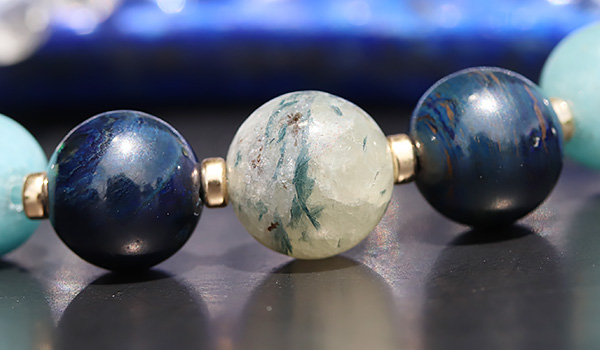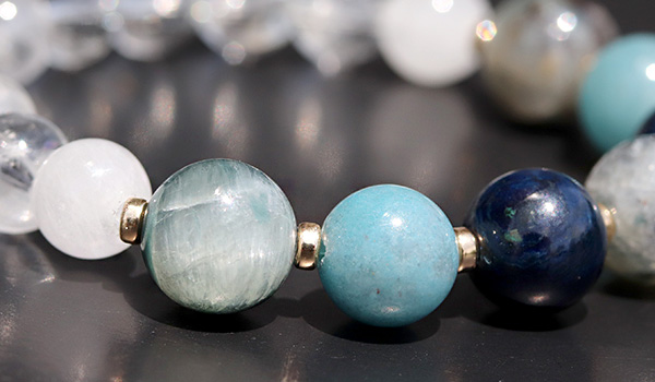 アースシードライト10mm、アジュライト10mm、トロレアイト9〜9.5mm、アゼツライト8mm、ヒマラヤ水晶7.5〜8mm