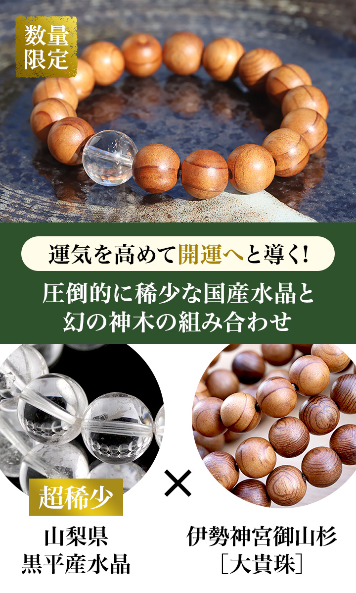 [●]【ラスイチ】デザインブレス(山梨県黒平産水晶・伊勢神宮御山杉[大貴珠])※ギャランティカード付き について