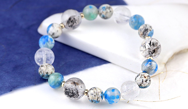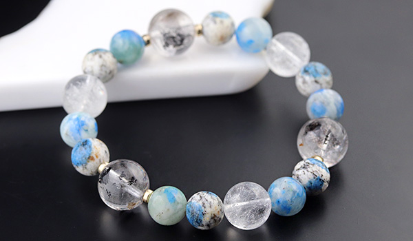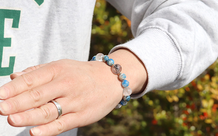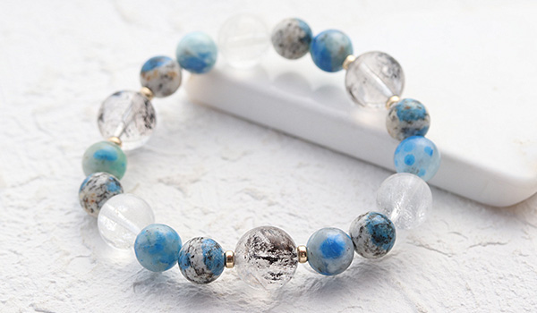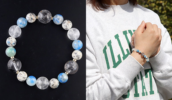 K2ブルーとK2ブルーシリカの青色が、モノトーンなブレスレットの中で