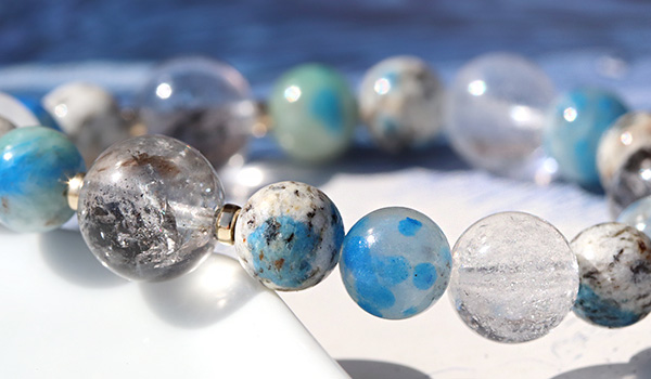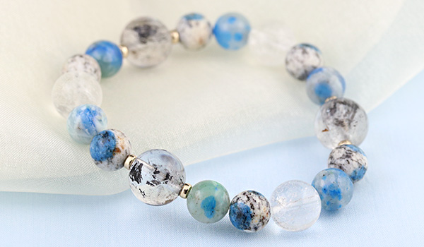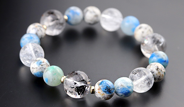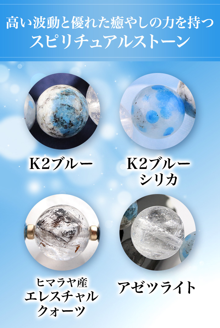 ヒマラヤ産エレスチャルクォーツ11〜11.5mm、K2ブルー8〜8.5mm、K2ブルーシリカ8〜8.5mm、アゼツライト10mm