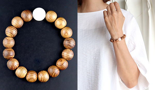伊勢神宮で生まれ育った杉の木から削り出したウッドビーズを、ベースストーンとして贅沢に使用しています。