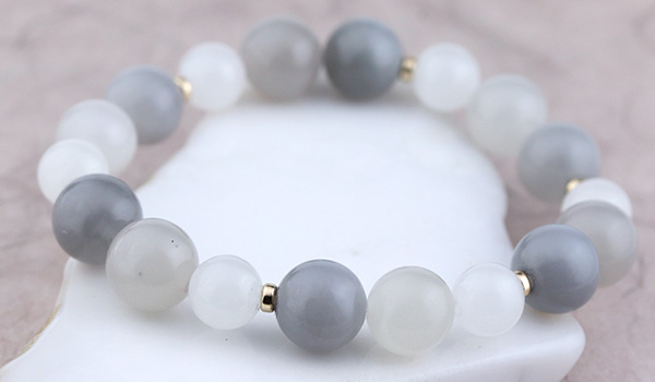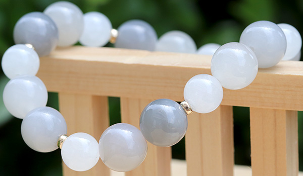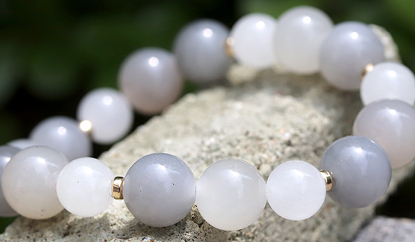 白磁のような清楚で上品な質感があり、まろやかな艶の美しい白色の和田玉(ホータンぎょく・ホータンネフライト)と、グレーがかった色合いの和田玉の濃淡があるビーズを組み合わせた、